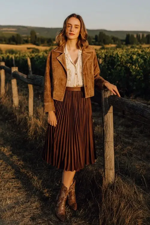 A pleated brown midi skirt paired with an ivory blouse and suede jacket makes a graceful statement.