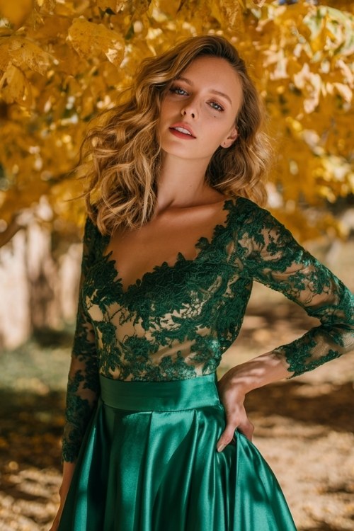 1. For an October wedding surrounded by fall colors, an emerald gown with a lace appliqué bodice and satin skirt offers timeless elegance.