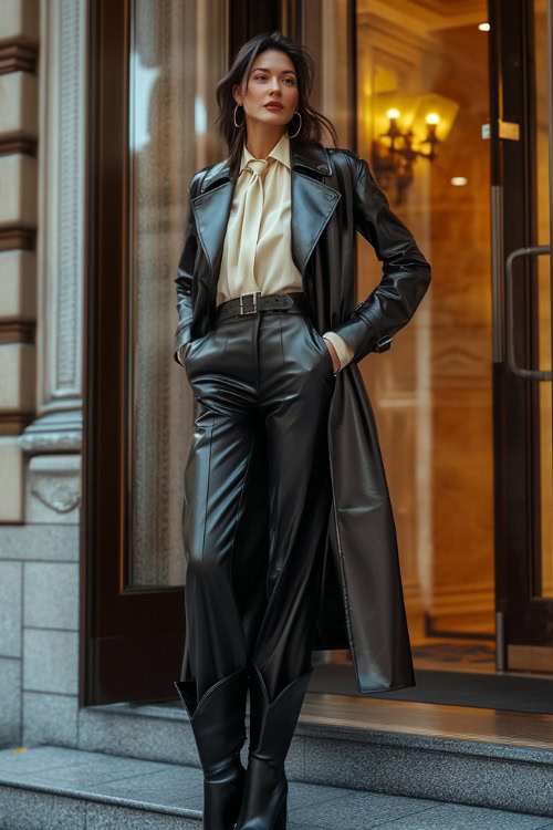 4. Go monochromatic with a black leather trench coat, wide-leg leather pants, and a cream silk blouse.