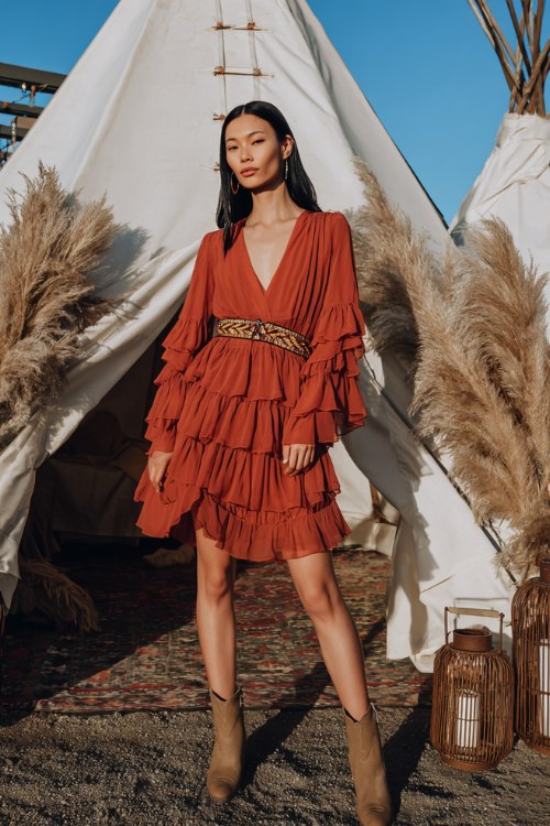 9. Attending a bohemian-inspired fall wedding? A tiered burnt orange ruffle midi with a detailed waist belt is playful and unique.