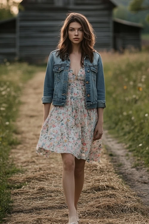 10. A floral sundress layered with a denim jacket is an easy way to achieve a casual, fall-ready look.