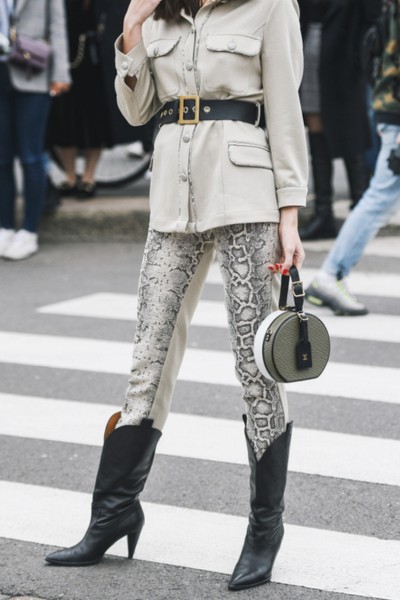 A pair of stylish black cowboy boots with snakeskin print pants and a light gray blazer can be tied together with a bold black belt, creating a strong style statement that reflects your personality without compromising neatness.
